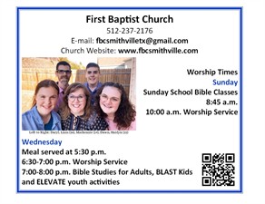 First Baptist Church Smithville 300 Hudgins Street/ PO Box 746 Smithville, Texas 78957 512-237-2176